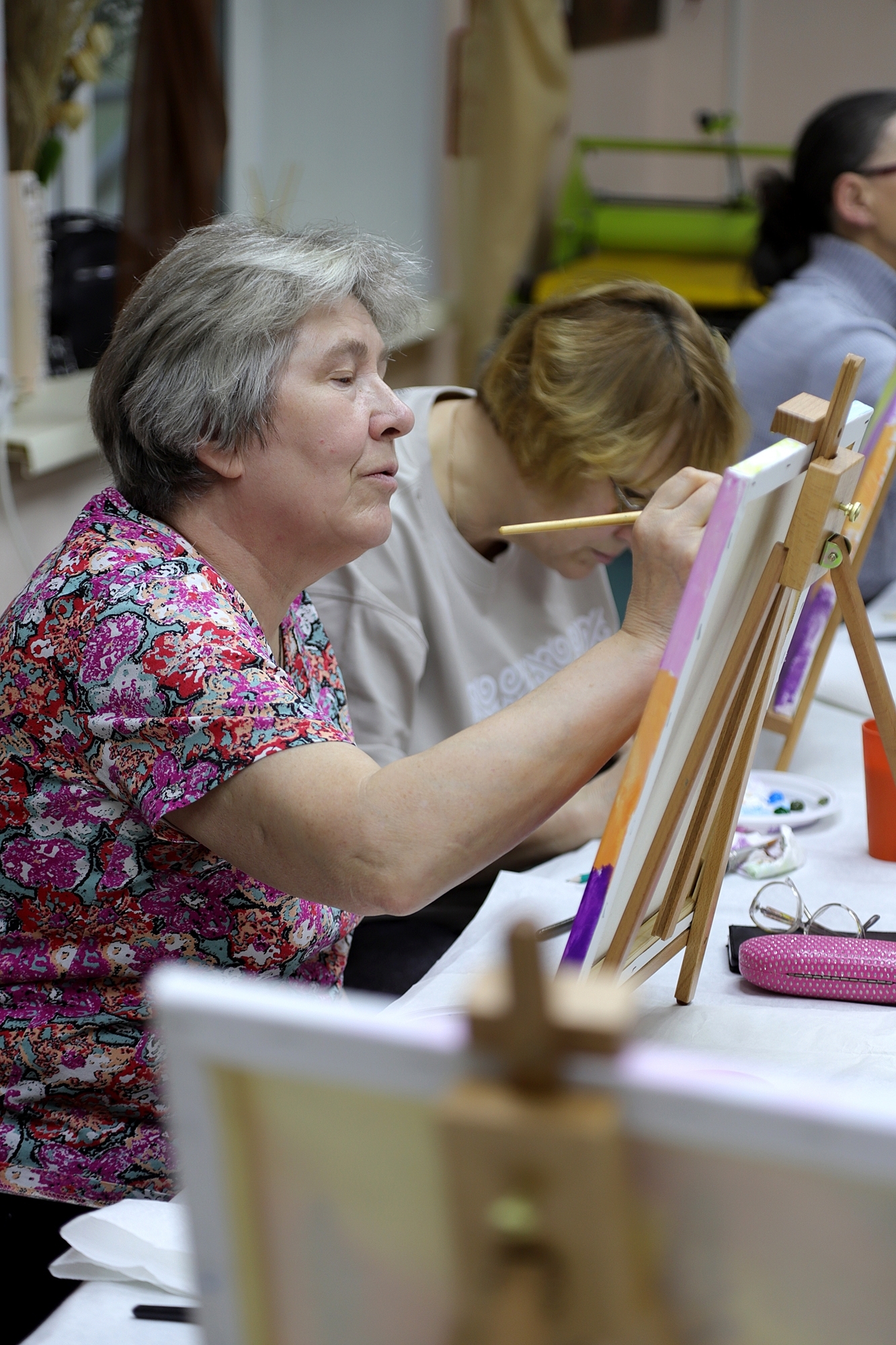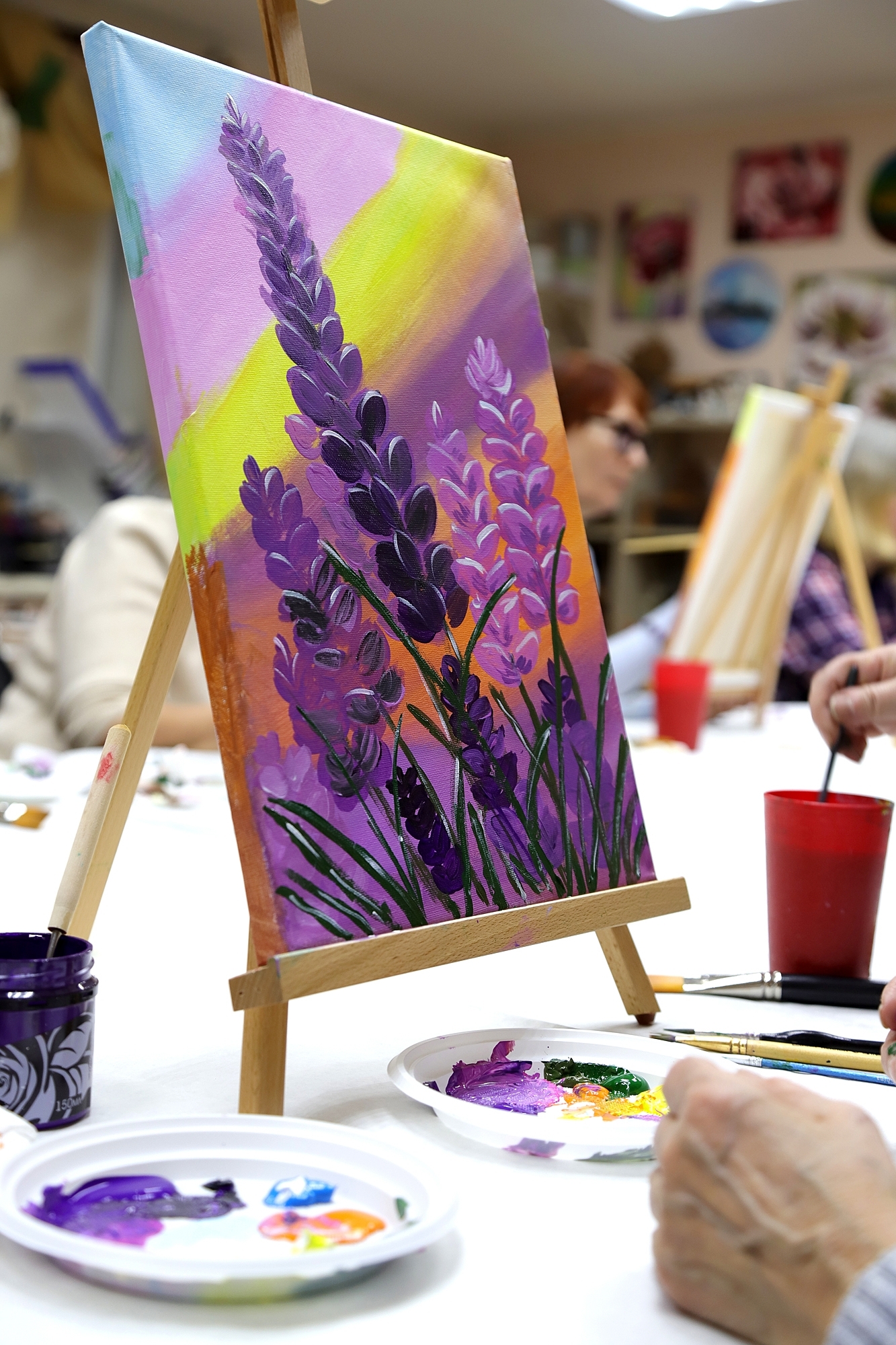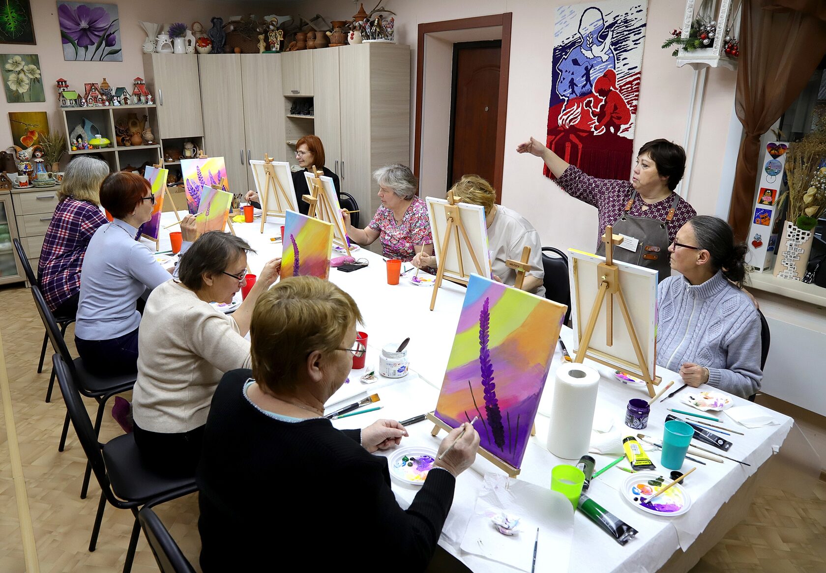 Участники мастер-класса, люди старшего возраста, с энтузиазмом взялись за кисти и краски, чтобы запечатлеть красоту люпинов на холсте. Под руководством опытного художника они осваивали технику живописи, учились смешивать цвета и передавать текстуру.